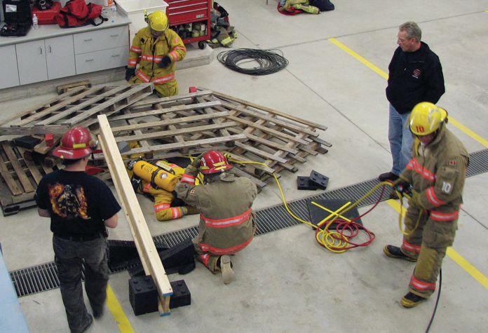 Above: The St. John’s Regional Fire Department practises sweeping for and removing any entanglements that may be found on the mayday firefighter. Below: A lifting operation is being set up and performed to free the trapped/pinned firefighter.