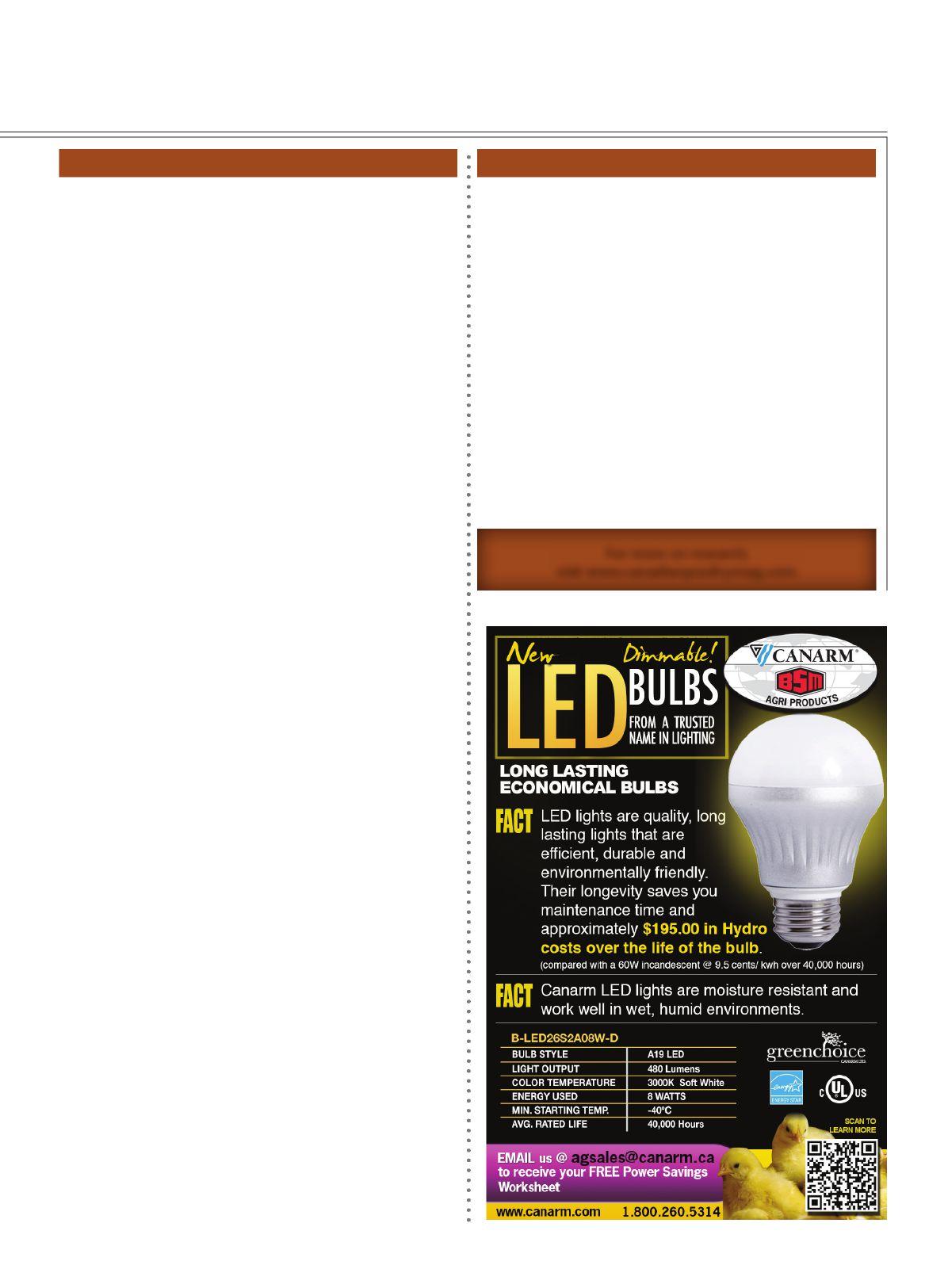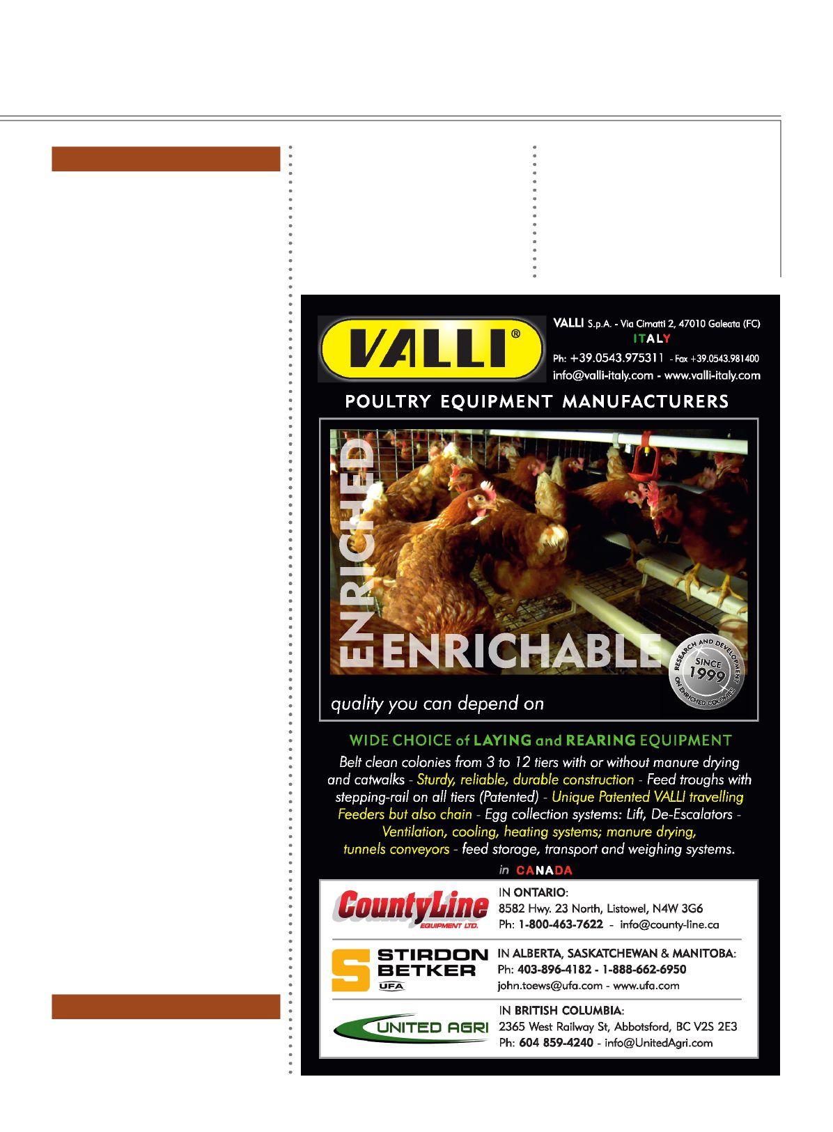 Occasionally, Canadian Poultry Magazine will mail information on behalf of industry-related groups whose products and services we believe may be of interest to you. If you prefer not to receive this information, please contact our circulation department in any of the four ways listed above. No part of the editorial content of this publication may be reprinted without the publisher’s written permission. ©2014 Annex Publishing & Printing inc. All rights reserved. Opinions expressed in this magazine are not necessarily those of the editor or the publisher. No liability is assumed for errors or omissions. All advertising is subject to the publisher’s approval. Such approval does not imply any endorsement of the products or services advertised. Publisher reserves the right to refuse advertising that does not meet the standards of the publication.