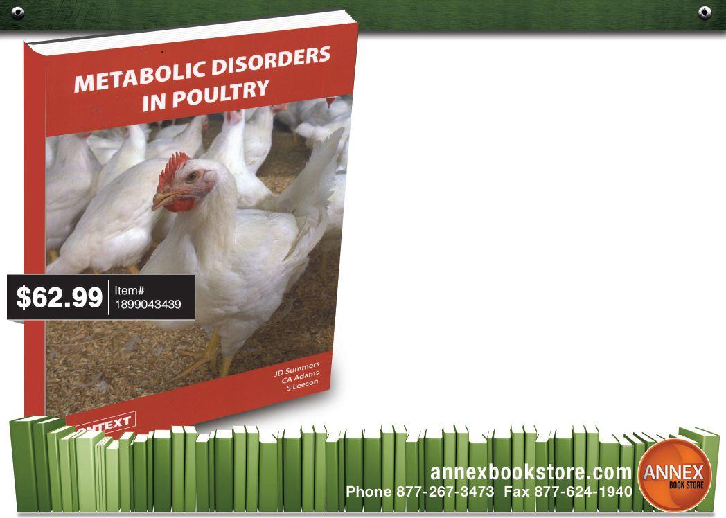 This book addresses the problems of all the significant metabolic disorders such as ascites, sudden death syndrome, liver and kidney problems and skeletal disorders. In some instances, methods of treatment or prevention are indicated.