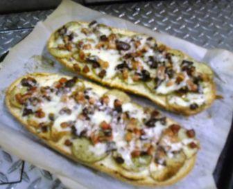 5. Spread the entire surface with the garlic paste and sprinkle with half the cheese. Cover with the potato slices, placing them edge to edge. Sprinkle with the pancetta and the remaining cheese. Artfully arrange the olives and rosemary over the top. Finish baking the flatbread for another 10 minutes. Remove the pizza from the oven and season with salt and pepper. Slice and serve immediately. Enjoy with an ice-cold beer!