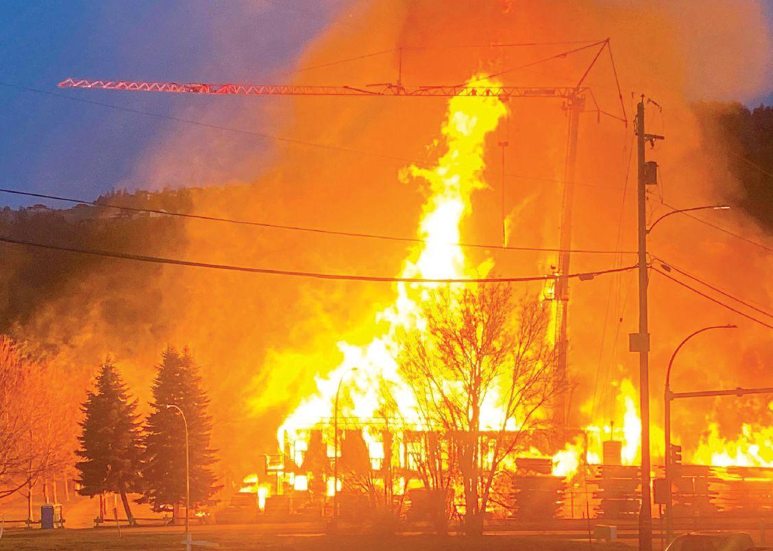 A blaze completely destroyed a four-storey condominium project and left an extremely damaged crane hanging over the site for several days.