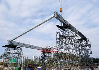 This oceanfront condominium tower was built to provide a luxury lifestyle for residents, which starts with a grand entrance composed of a free spanning structure. The frame of plate girder and tube steel spans 150 feet from the building façade to a waterfall feature. Because the curved beams are under compression at both ends, the structure was able to be erected without intermediate support columns. One of the main challenges was the number of mobil-