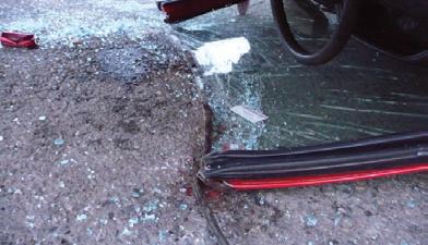 into the crowd and no one was aware of it because the spectators were not facing into the sun. I ordered all spectators to move back until the dust settled, and told the competing crews to keep their masks on until it was safe. I had known glass dust could linger but I hadn’t realized to what extent. When I got back home I started doing some research on glass dust and the associated hazards. In discussions with many glass-replacement and windshield-glass manufacturers I was informed that today’s laminated glass is made up of 70 per cent silica and other raw materials. Modern laminated windshield glass is made of poly vinyl butyral, iron oxide, silica sand, soda ash, dolomite and limestone.