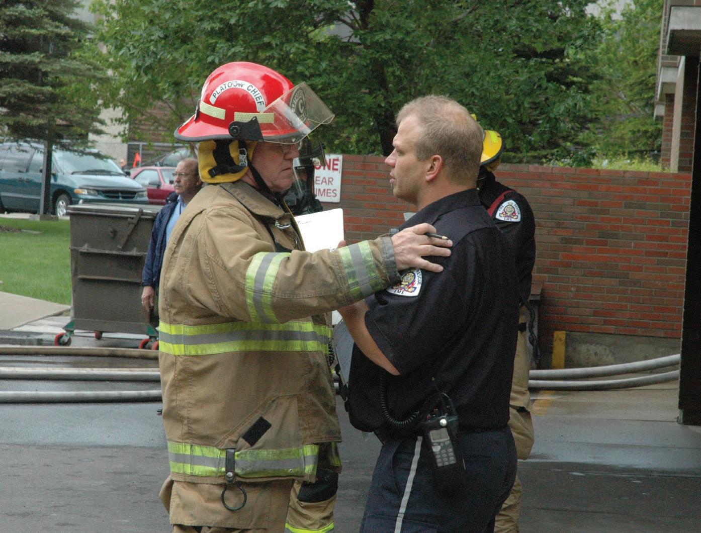 Lethbridge’s integrated fire/EMS, which began in 1912, has proven effective with all firefighters trained as paramedics. Platoon Chief Bill Mellafont confers with firefighter/paramedic on scene during a fire at a high-rise last summer.