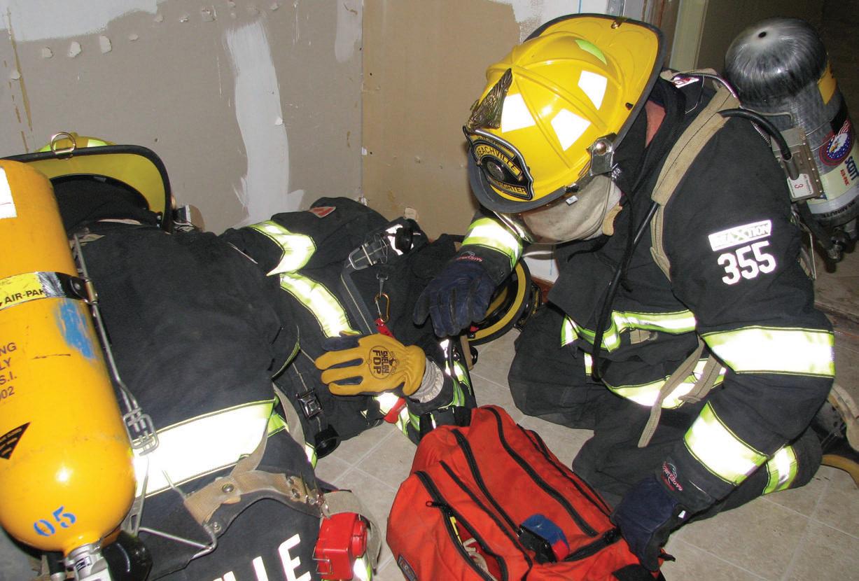 Firefighters/paramedics Scott Lane (left) and Randy Crow prepare to attend to patients at the scene of a high-rise fire in June 2008.