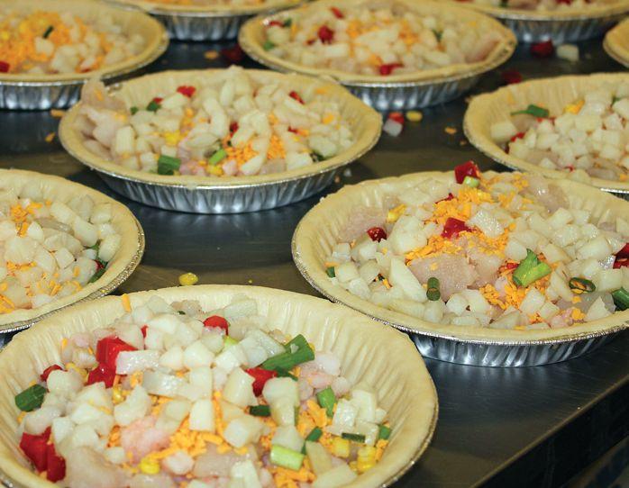 Megan Anatol, manager of Masstown’s Catch of the Day Fish & Chip Boat, is the chef behind the seafood pie’s hearty filling. When it comes to recipe development, she says she likes to start with an idea or ingredient and work backwards. In the case of their seafood pie, the thought was to base it on traditional seafood chowder. On the technical side, Anatol found it challenging to nail down a seafood filling that could be baked and set yet remain creamy.