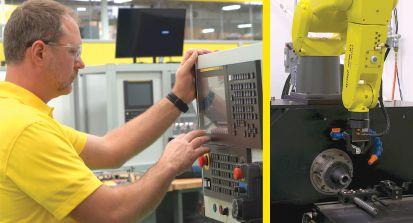 FANUC CNCs can now control connected FANUC robots providing machine tending or other assistance through FANUC’s Quick and Simple Startup of Robotization (QSSR). FANUC America’s QSSR package simplifies the connection of a FANUC robot to a FANUC-controlled machine tool through a high-speed Ethernet cable. The new QSSR G-code feature allows operators and machine tool builders to program robots through the FANUC CNC in ISO standard G-code format. Those unfamiliar with robotic