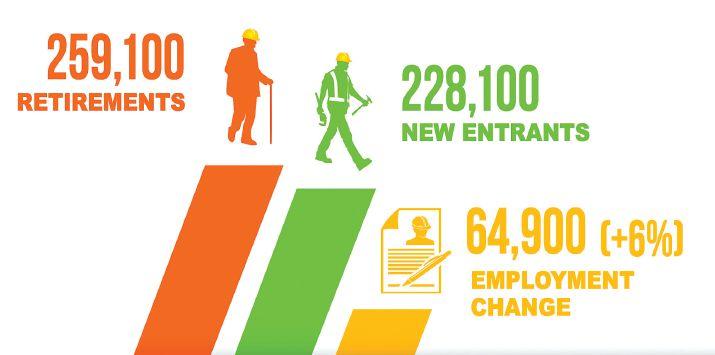 The development of skilled tradespersons in the construction industry takes years and often requires participation in a provincial apprenticeship program. As such, replacing retiring workers typically requires several years of pre-planning to avoid the creation of skills gaps. By 2030, overall hiring requirements in the industry are ex-