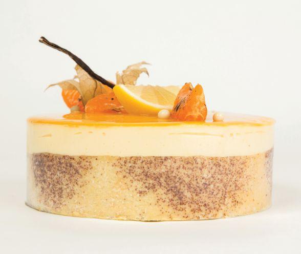 Maracuya, a mousse cake, is made with passion fruit, orange and lemon, with vanilla cream and coconut Mona Lisa biscuit.