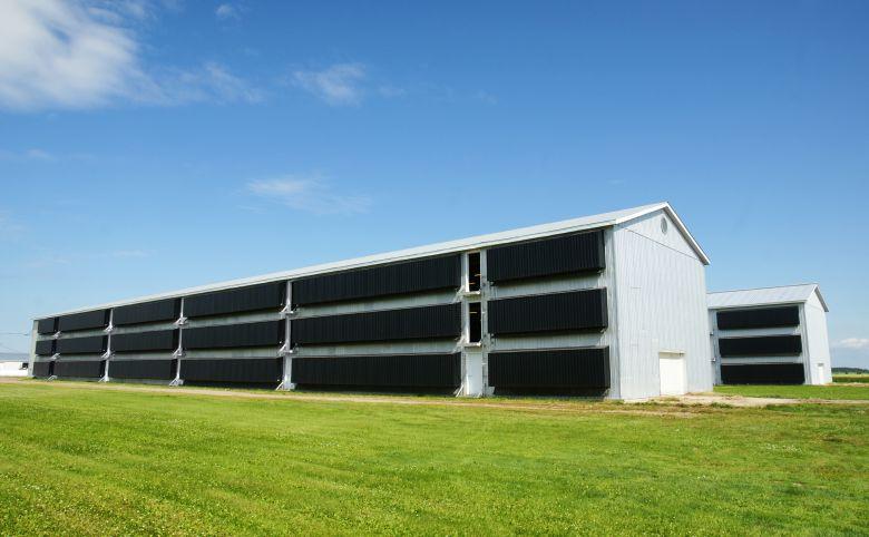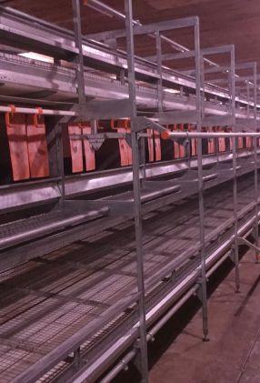 The organic barn is outfitted with a double row Big Dutchman Natura 24-21 aviary system. It was converted from a deep pit cage barn in 2014. In 2016, a slatted floor barn was renovated to free-range, with each side having a single-row Big Dutchman 24-18 Natura Step free-run aviary system. The pullet barn was also renovated to aviary-train the pullets with a Big Dutchman Primus system. Environmental monitoring for all barns is provided by Maximus. Canarm fans cross-ventilate the layer barns and tunnel-ventilate the pullet barn. Heat in all barns is provided by Hired Hand space heaters. LED lighting is provided by Once; layers receive dim-to-red technology (for calming and laying performance) and pullets receive dim-to-blue technology (to stimulate development).