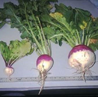 LEFT Turnips taken from a field trial conducted at North Carolina State University with randomized plots of (from left to right) zero, 10 percent and 20 percent by volume vermicompost mixed into the soil. All treatments had equal amounts of nitrogen.
