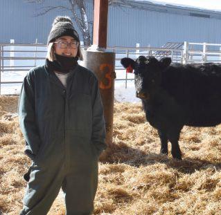 Master’s student Rhea Teranishi stands with cattle in the feeding experiment.