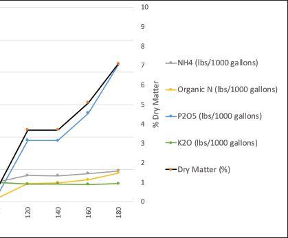 Figure 1 shows nutrient and dry matter concentrations from an unagitated liquid manure storage at a Pennsylvania sow farm. This unpublished data (Meinen, 2011) demonstrates that higher levels of dry matter contained higher levels of P in this storage. During this unloading process, manure was pumped from the very bottom of the storage where the initial loads were very thick (loads one to five) before the liquid portions could