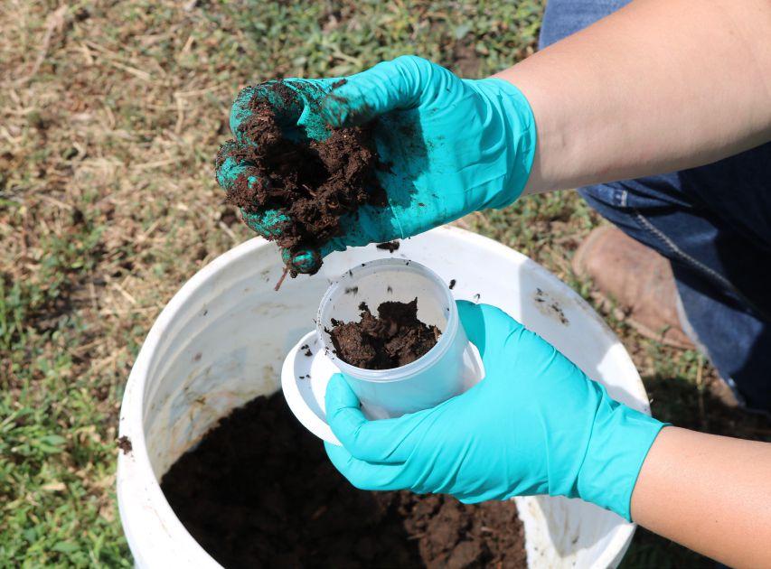 To start the sampling process, collect 10 to 15 quart-sized subsamples using a spade or shovel from various locations and depths in the pile. Avoid sampling the dry top crust or other parts of the stockpile that may not be representative. Mix subsamples thoroughly in a bucket. Collect 1 to 2 pints and place in sealable plastic bag or a plastic bottle with a lid, or use the sampling containers the lab has provided you.