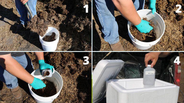 1. Collect 10 quart-sized subsamples from various depths and locations in the manure pile and place them together in a bucket.