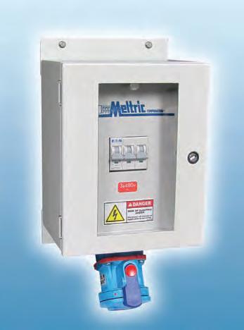 On page 29, item 412 from Meltric is an electrical receptacle box designed for wet environments that includes built-in circuit protection for safety. It also offers a dead-front safety shutter for protection from live parts and arc flash, a practical and safe combination in a unique design.