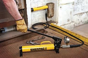 and base are cast from steel that is sculpted to reduce weight. The tie rod design allows the pump to be easily disassembled for maintenance or servicing. An integrated carrying handle assures durable and hassle-free mobility, and the Sure-Grip release knob enables simple gripping and handling, with or without gloves, for firm control while releasing pressure. Enerpac