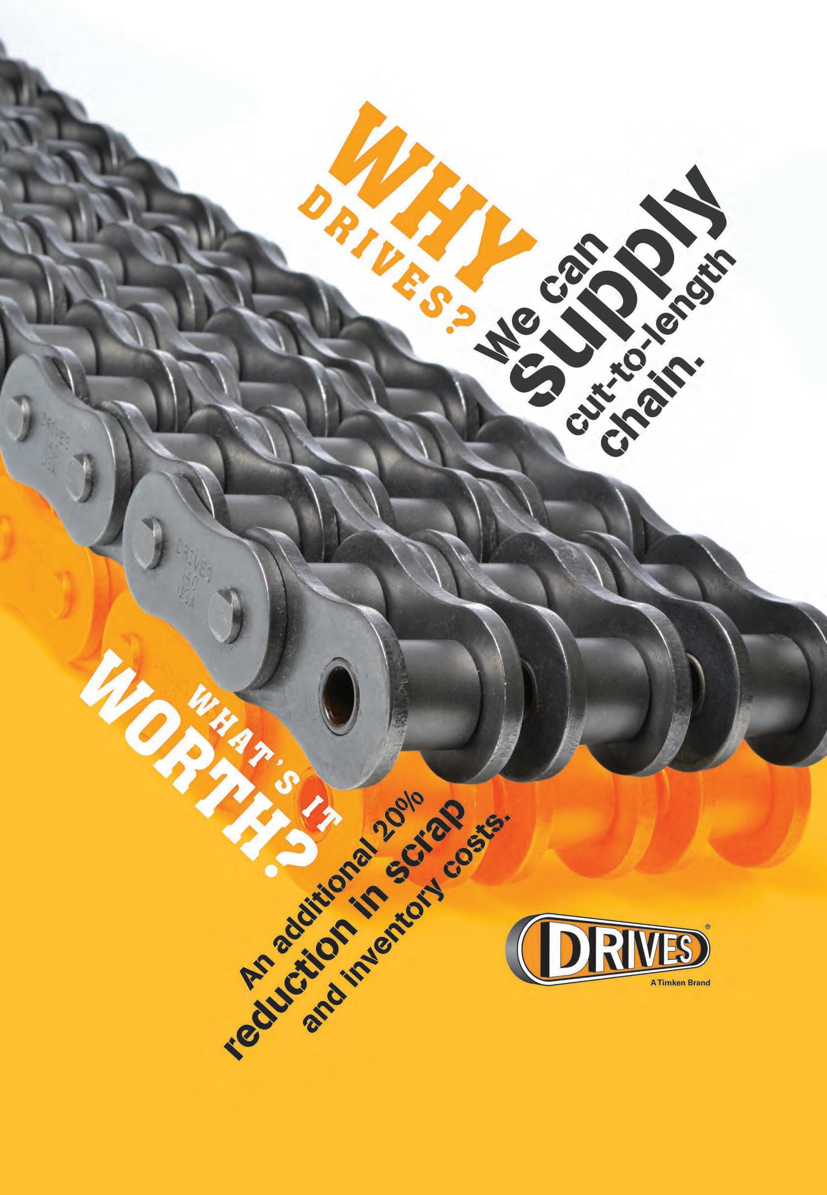Imagine a stainless steel product that could offer you Higher Gross Profit Margins with no premium over standard 300SS Series Chain. Drives imagined it — and we are making it work for you. With 600SS series round parts and 300SS series side plates, the Drives “AS” series chain gives your customers a 50% higher working load over 304SS series chain while increasing wear life and providing excellent corrosion resistance. To view our complete line of products, visit www.drivesinc.com.