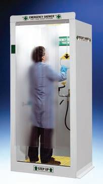 eye/face wash for immediate drenching of personnel that have been exposed to hazardous chemicals. In addition, it is equipped with frosted front strip curtains, interior grab bars, raised deck grating, and bottom or rear drain outlet.