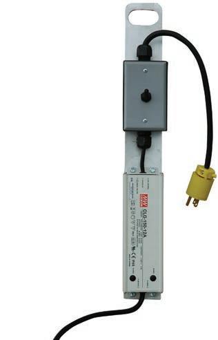 The Magnalight DCP-11-DP-SW waterproof power supply converts standard 120/240-VAC power to 11-amp, 12-VDC output for powering lights and equipment requiring 12-volt direct current. It is fitted with an inline switch, allowing operators to control the on/off operation of equipment. Designed for durability and resistance to wet or damp conditions, the small unit consists of a power converter, heavy-du ty on/off switch, straight blade plug, and a two-prong Deutsch connector on the output end, all mounted to a heavy gauge strip-type mounting platform. The converter measures 8.7 in. long by 2.5 in. wide by 1.5 in. deep and weighs less than 1 lb, making it suited for inline use with