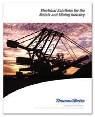 Thomas & Betts’ brochure, Electrical Solutions for the Metals and Mining Industry, outlines the company’s electrical systems solutions for vehicles, machinery and processing plants in the mining and metallurgy industries. The brochure is organized around product groupings that provide solutions to specific challenges, as well as indicating which product lines, services and training programs are designed to address each of these challenges. Products are included for continuous operation and sustainability, corrosion and harsh environment protection, liquid ingress protection, safety and contamination, extreme temperature protection, hazardous location protection, efficiency and reliability, and grounding and bonding.