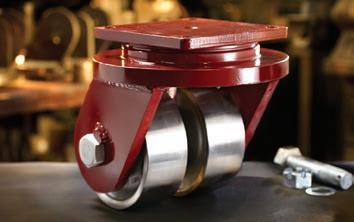 in.-thick legs are welded continuously inside and outside the base. The main load bearing is a 7-in.-diameter thrust ball bearing, while the secondary load bearing is a 1-1/4-in. precision tapered roller bearing to counteract radial thrust. The series is offered in wheel diameters starting from dual 8-in.-by-3-in. wheels rated at 28,000 lb up to dual 12-in.-by-4-in. wheels rated at 40,000 lb. Hamilton Caster & Mfg. Co.
