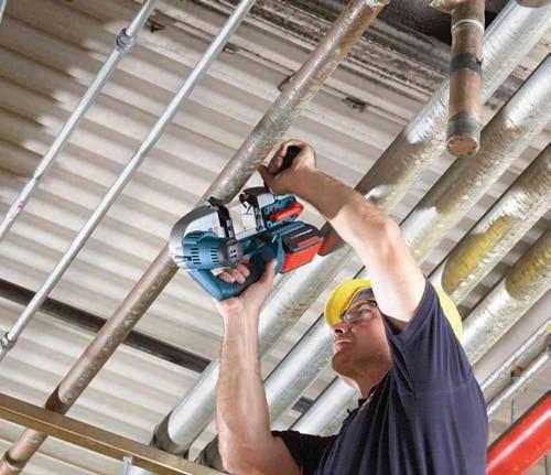 The Bosch BSH180 cordless bandsaw cuts a variety of materials, including metal, copper pipes and electrical cables, and can be used in tight spaces. This rugged tool is powered by an 18-V fat or slim battery pack, which allows for more than