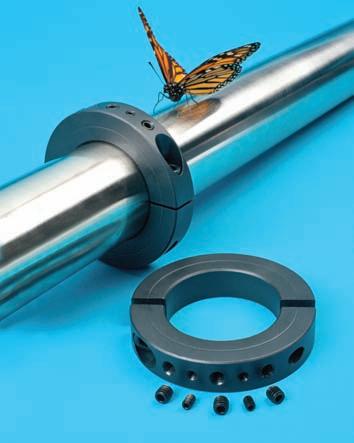 A line of large-bore shaft collars for heavyduty applications in the construction, defence, excavation, heavy equipment, mining, pulp and paper, petro-chemical, waste processing and similar industries is available from Stafford Manufacturing. These shaft collars feature bore sizes up to 14 in. I.D., are offered in one- and two-piece clamp-type configurations with smooth- or threadedbores and are supplied with one or more alloy socket cap screws. They can be machined from steel, stainless steel, brass, bronze and other materials with varying widths