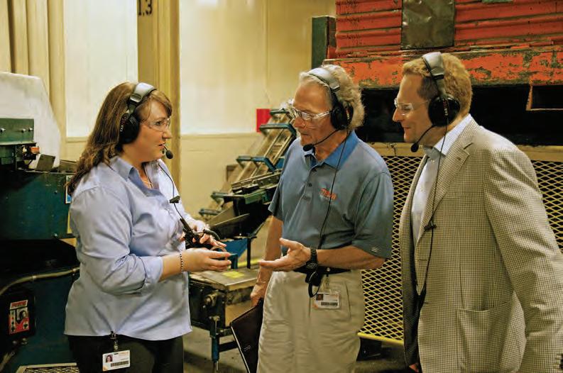 Machined green cups for Timken tapered roller bearings stand ready for the hardening process, to be followed by carburizing. 2. Timken Canada’s Frank Mascia stands with an order from Arcelor Mittal Dofasco. Timken understands the extreme conditions bearings face – heat, water, contaminants and more. It works closely with Arcelor Mittal Dofasco through BDI, an authorized Timken distributor. 3. From right: Frank Mascia, managing director of Timken Canada, discusses surface finishing techniques with Bob Daniel, general manager for business communications, and Nicole Richardson Owens, Gaffney product manager. 4. ‘Naked’ cones for Timken tapered roller bearings head to the next precision operation in the Gaffney, SC, facility.