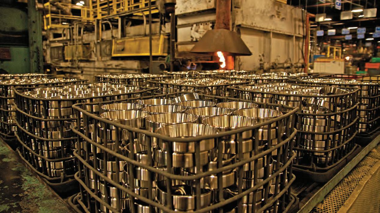 This plant is well-equipped to produce cups and cones using single- and multiplespindle screw machines and CNC chuckers, heat-treating equipment for carburizing and hardening, and lines for grinding, assembly and inspection. Rollers are made using cold-forming headers, through-feed carburizing, through-feed hardening and 25 through-feed finish grinding lines.