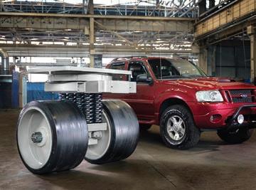 US federal contractor. Fully assembled, each Colossus caster stood 52 in. above the factory floor, weighed more than 8,000 lb and boasted a payload capacity of 200 tons. The casters were designed with a spring-loaded suspension system to absorb shock. The swivel construction consisted of 32-in.- and 18-in.-diameter raceways flame-hardened to 55-60 HRC with a total of 96 1-1/2-in.-diameter bearing balls. Each caster also featured an eightposition swivel lock for directional control, a 7-in.-diameter oscillating axle to accommodate uneven surfaces and a foot-operated braking system. The massive payload required 36-in.-diameter by 20-in.-wide extreme-duty press-on tires with 4-1/2-in.diameter tapered roller bearings. Hamilton Caster & Mfg. Co. www.hamiltoncaster.com