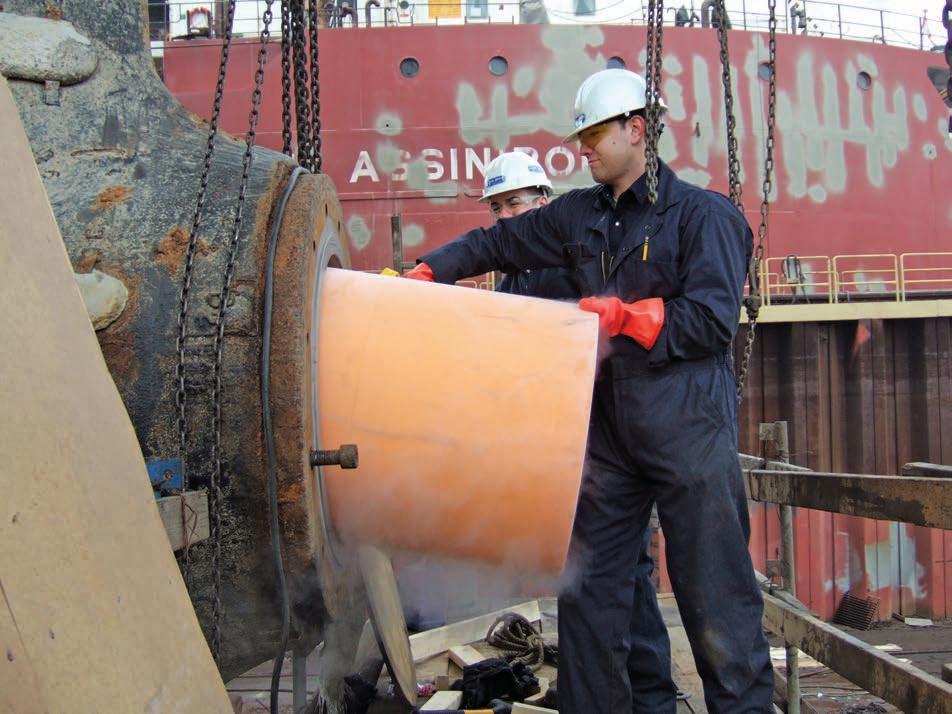 ‘To ready the bearings for installation, LMI put them in a tub of liquid nitrogen. They shrank by 15%, plenty of room to slide into the stern tubes before warming up to a tight fit.’ Scott Groves / 18