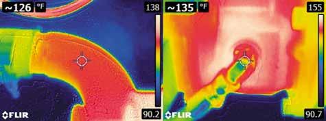 Dans de nombreux cas, le débitmètre n’est pas installé sur la conduite, en raison qu’un tel modèle n’est pas disponible ou qu’il nécessiterait un trop long temps d’arrêt pour l’installer. Une autre méthode pour déterminer l’usure et la dérivation de la pompe consiste à enregistrer initialement les températures dans les conduites d’aspiration et de drain de carter. L’huile dans la conduite d’aspiration doit être très proche de la température de l’huile dans le réservoir. Comme l’huile qui s’écoule par la conduite du drain de carter n’effectue pas un travail utile, de la chaleur sera générée. Bien entendu, cette conduite sera plus chaude que l’huile entrant dans la pompe par la conduite d’aspiration. On peut voir les températures d’aspiration et de drain de carter à la Figure 3 . L’huile pénètre dans la pompe à 126°F (52 °C) et sort dans le drain de carter à 135 °F (57 °C). Au fur et à mesure que la pompe s’use, la dérivation augmentera, ce qui aura pour effet d’augmenter la température de la conduite du drain de carter. Une pompe vérifiée un mois plus tard, dont la température dans le drain de carter s’élèverait à 145 °F (63 °C), aurait subi une usure considérable. Étant donné que l’écoulement d’un drain de carter peut varier d’un fabricant de pompes à l’autre, il est essen-