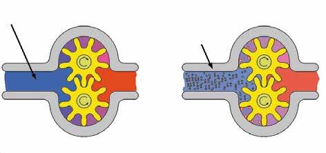 duit chaque fois que la pompe essaie de fournir plus de volume que celui qu’elle reçoit par sa conduite d’aspiration. Chaque fois que le débit d’aspiration est altéré, la pression d’aspiration chute très bas. Cela entraîne la formation de cavités d’air dans l’huile lorsque les molécules d’air sont extraites de « l’air dissous » dans le fluide. Lorsque les cavités d’air arrivent du côté pression de la pompe, la haute pression provoque leur implosion, endommageant la pompe. La pompe réduira alors son débit, et finira par se détruire ellemême.