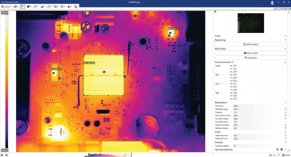 Le logiciel d’analyse et de génération d’images thermiques Thermal Studio de Flir Systems inc. est destiné aux thermographes qui utilisent des caméras thermiques portables Flir, des caméras d’imagerie optique du gaz (OGI) et des drones équipés de caméras thermiques. Ce logiciel propose des fonctions de mesure, une fonctionnalité de formule avancée et des modèles d’analyse personnalisés. Il permet de traiter des lots de photos ou de vidéos thermiques. Les opérateurs de drones qui enregistrent de nombreuses images lors d’une étude de lieu peuvent réviser ou extraire des données de points chauds et les exporter pour une analyse ultérieure. Le Thermal Studio de Flir permet d’accélérer le traitement postproduction d’images et de vidéos thermiques complexes, notamment des tracés multisources et des calculs informatisés de formules, l’exportation multiformats et l’imagerie dynamique multispectrale de Flir, laquelle superpose des détails de lumière visible sur des images thermiques. Prenant en charge plus de 20 langues, le programme est compatible avec Windows 7, 8 et 10. www.flir.com/thermal-studio