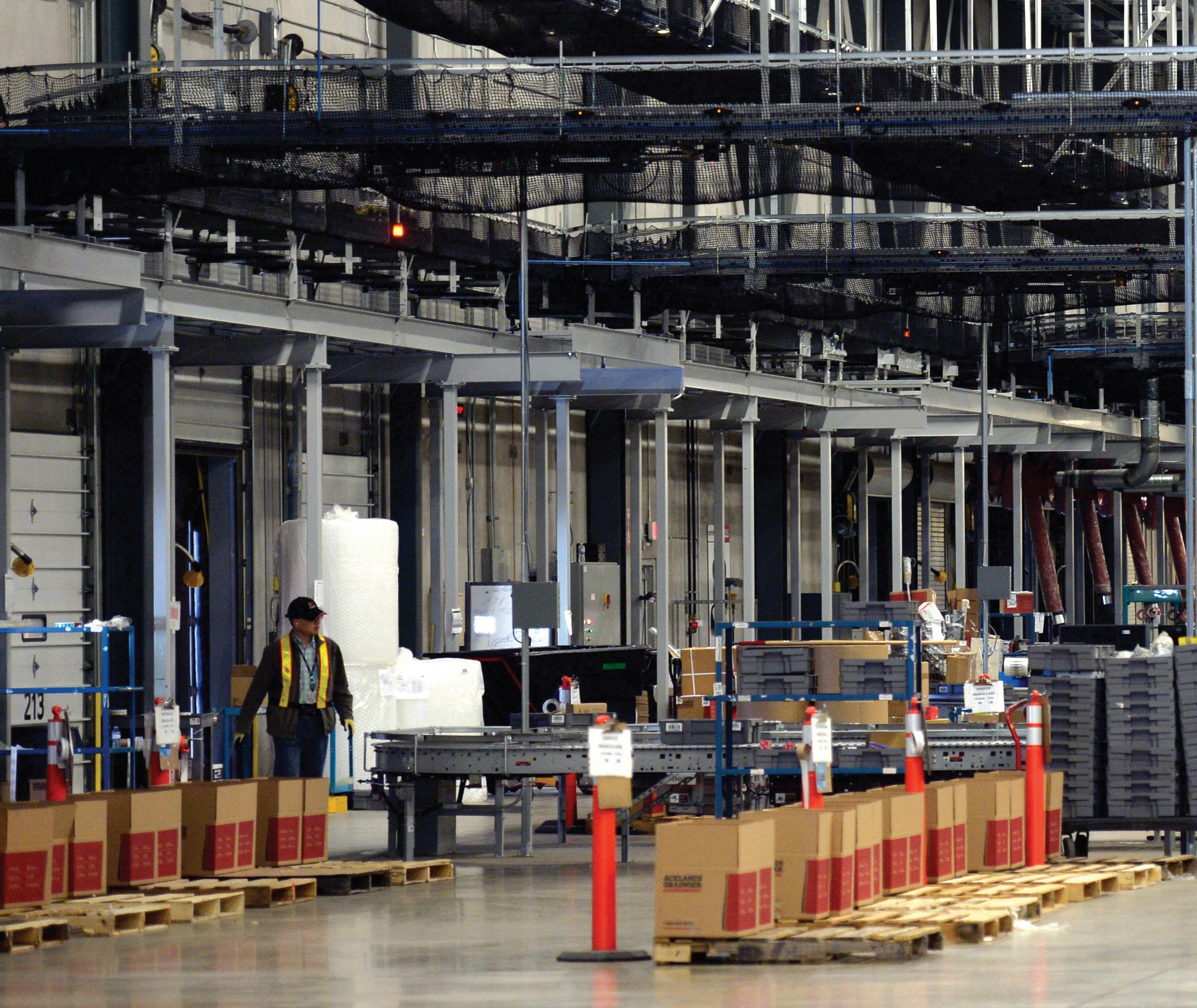 L’une des machines les plus intéressantes de l’usine fabrique des boîtes d’expédition en carton pour la multitude d’objets de forme irrégulière à expédier. Les ouvriers prennent les mesures de l’objet, et la machine crée une boîte qui lui correspond presque parfaitement. Cette approche personnalisée permet d’optimiser l’utilisation du carton, de réduire les coûts d’emballage et d’assurer un minimum de déchets une fois le produit rendu chez le client.