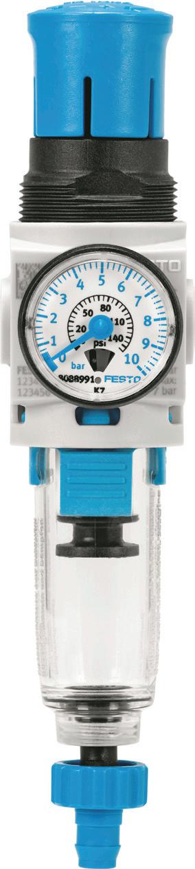 Le régulateur d’air comprimé MS2 pèse de 28 à 31 g et le filtre-régulateur MS2 pèse de 35 à 38 g. La largeur des deux unités totalise 28 à 31 mm selon le raccord (M5 ou QS6) utilisé. Léger et de petite dimension, le MS2 peut être installé directement sur des composants en mouvement dans des applications dynamiques. Malgré leur grande capacité de commande, les unités MS2 ont un effet négligeable ou nul sur la cinématique de la machine ou du système sur lequel elles sont installées. Fabriquées en matériaux polymères, les unités de service MS2 procurent un débit de 350 l/min pour le régulateur de pression et de 310 l/min pour le filtre-régulateur. Elles sont en mesure de filtrer des particules aussi petites que 5 microns. Les boyaux d’un diamètre extérieur de 6 mm peuvent être raccordés directement au MS2 à l’aide de raccords QS6. www.festo.com