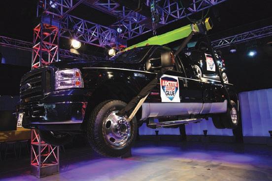 Henkel Corporation’s Loctite brand successfully lifted a full-size Ford F350 Dually Crew Cab pickup truck, with a Smart Fortwo compact car in its bed, and suspended it in the air for an hour, meeting the worldrecord requirement. The overall weight of the vehicles was 5.02 tons — nearly one ton more than the previous record.