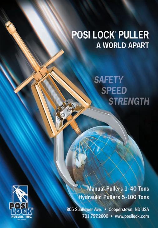 Posi Lock’s hydraulic product line has been expanded to include a three-jaw, 25ton internal/external puller. The PH113IE puller features internal puller jaws that have a reach from 63.5 mm to 177.8 mm (2.5 in. to 7 in.) and a spread from 203.2 mm to 533.4 mm (8 in. to 21 in.). The external jaws have a reach of 305 mm (12 in.) and a spread of 64 mm to 457 mm (2.5 in. to 18 in.) with stand ard jaws. Optional long jaws are available. Replacing the jaws is a question of simply removing the ball lock pins and inserting the desired jaws. These hydraulic pullers are useful for the removal of gears, bearings and other press fit items in diverse industries.