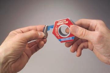 simply peeled from the spool and wrapped around the fastener’s threads, with the size of the fastener determining the number of wraps required, and it is removable with hand tools. It fixtures in 30 mins., and full cure is achieved in 24 hours. Operating temperature range is minus 65°F to plus 300°F. Henkel
