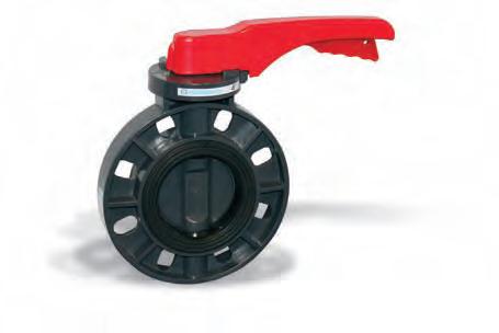 Sure-Tuff BYCS series butterfly valves from Hayward Flow Control offer an economical yet corrosion-resistant alternative to cast iron butterfly valves. Available in sizes 2 in. to 8 in. with hand lever or gear operators, the valves feature a maximum pressure rating of 10 bar (150 psi) for all sizes, and a service temperature of up to 60°C (140°F). Features include an ergonomic red handle with a lockout feature, a wafer body design, a PVC body with PVC disc, 410-grade one-piece stainless steel stem and an EPDM-booted seat. Options include electric or pneumatic actuation, and monitoring controls such as LHB manual limit switches for critical service applications. The valves fit ANSI 125 or PN10 flange patterns. Typical applications include marine and corrosive environments, water/theme parks, aquariums, aquaculture and irrigation systems.