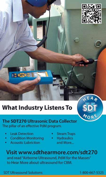The SDT200 ultrasound detector from SDT International pinpoints compressed air leaks through miles of twisting air lines with laser-point accuracy and quickly inspects hundreds of steam traps. Primarily focused on energy conservation and environmental applications, the instrument provides a robust solution at an affordable price. Features include a standard internal ultrasound sensor, internal temperature sensor, internal laser pointer, one external sensor connection to attach optional sensors, internal memory with 400 node locations to store static measurements, and a standard USB connection for data-dump software.