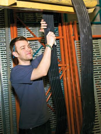 Top: Employees gather in front of the new facility in Montreal. Above: Belts are cut to size in the shop.