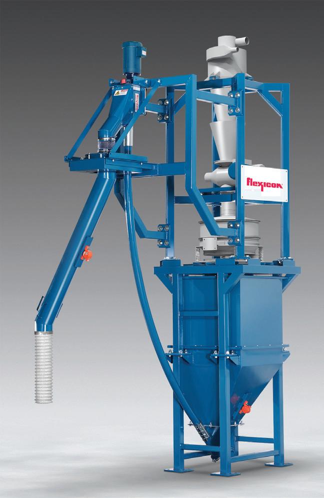 Flexicon Sizing-Dispensing System is fed by a pneumatic conveying line, and is equipped with an integral cyclone that separates incoming solids from the air stream.