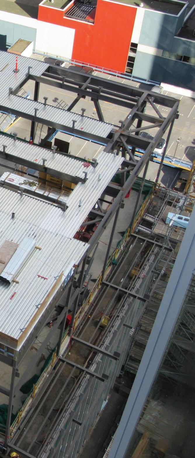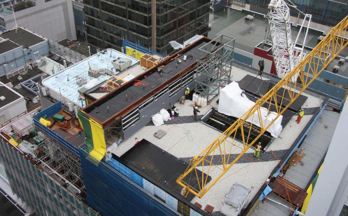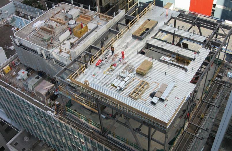 Construction started following contract award, with the submission of shop drawings for the numerous trades that were involved on the project, procurement of materials, and the application for municipal permitting and road closures. A tower crane was erected on the building’s lower roof (Level 9) to transport materials from street level to Level 13. Once pre-construction activities were completed, the site had been prepped for the new build, structural steel was delivered