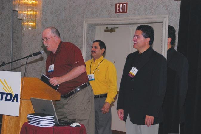 Retiring Barry Nicholson, Kaman Industrial Technologies, was acknowledged for his service to the PTDA as Ajay Bajaj, Rotator Products, and Paul Meo, NTN Bearing Corp. of Canada, look on.