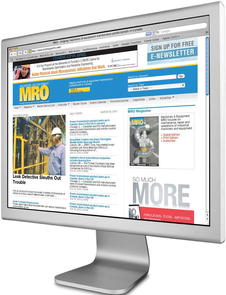 Our reader service cards also can be mailed or faxed to us with the enquery numbers circled so you can obtain more information from suppliers on the products or stories in which you have an interest. However, it’s even faster and easier to use our new online reader service card (RSC) function at www.mromagazine.com/rsc.