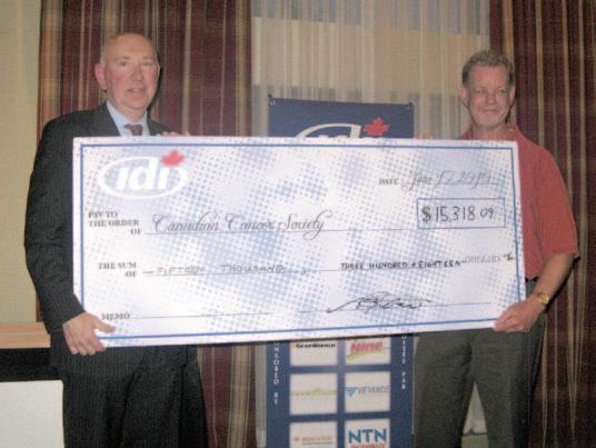 Scott Bebenek (r), president of IDI, hands a giant cheque to Bob Ascah, a representative of the Canadian Cancer Society.