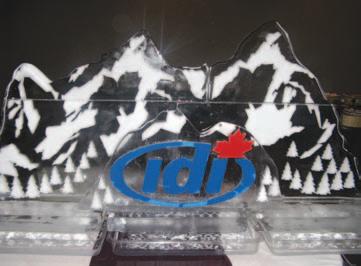 Ice sculpture prepared by the Delta Lodge At Kananaskis shows IDI’s logo on a scenic mountain backdrop.