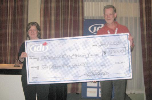 Scott Bebenek gives an IDI cheque to Kathy Ramage of Triton Industrial for women’s breast cancer research.
